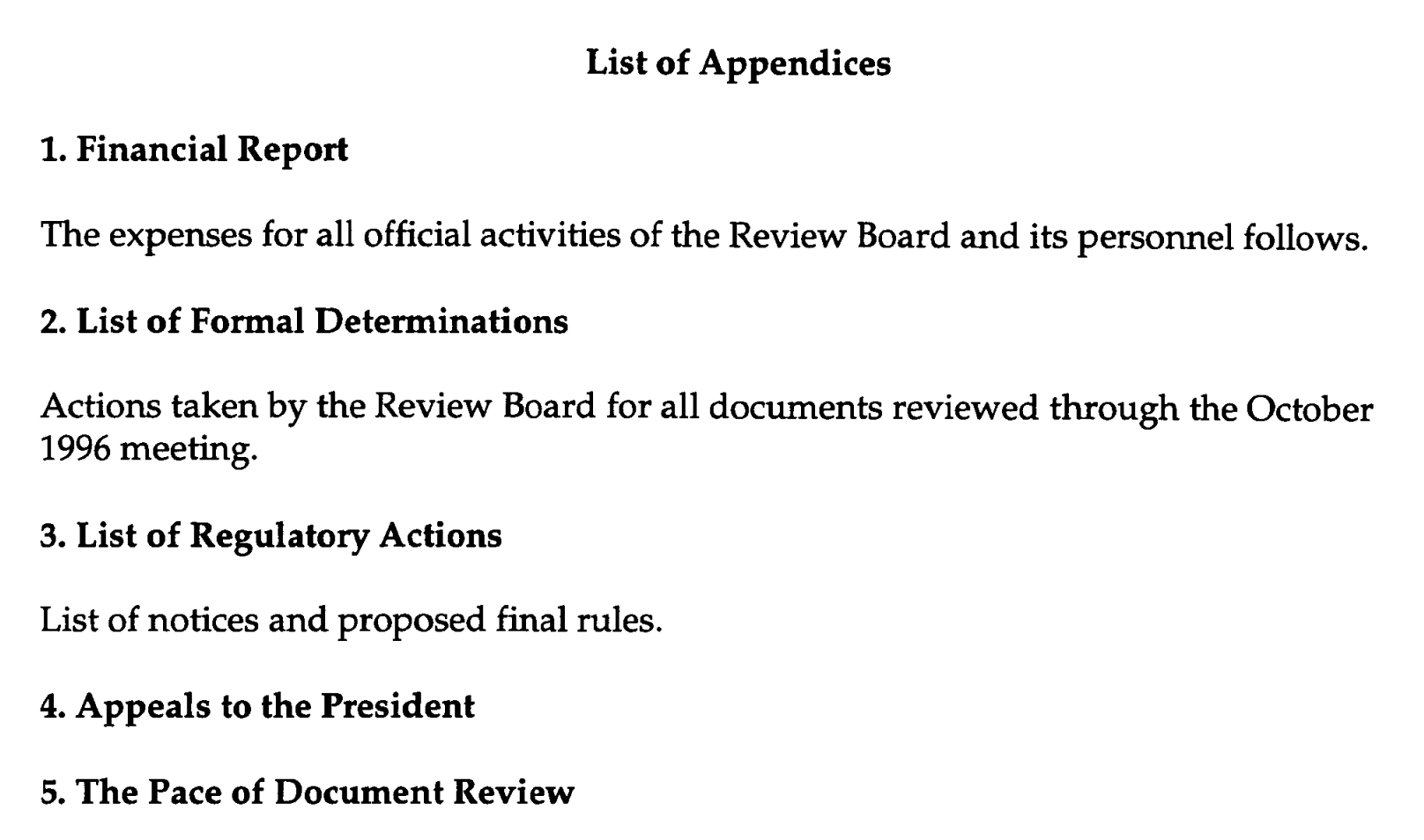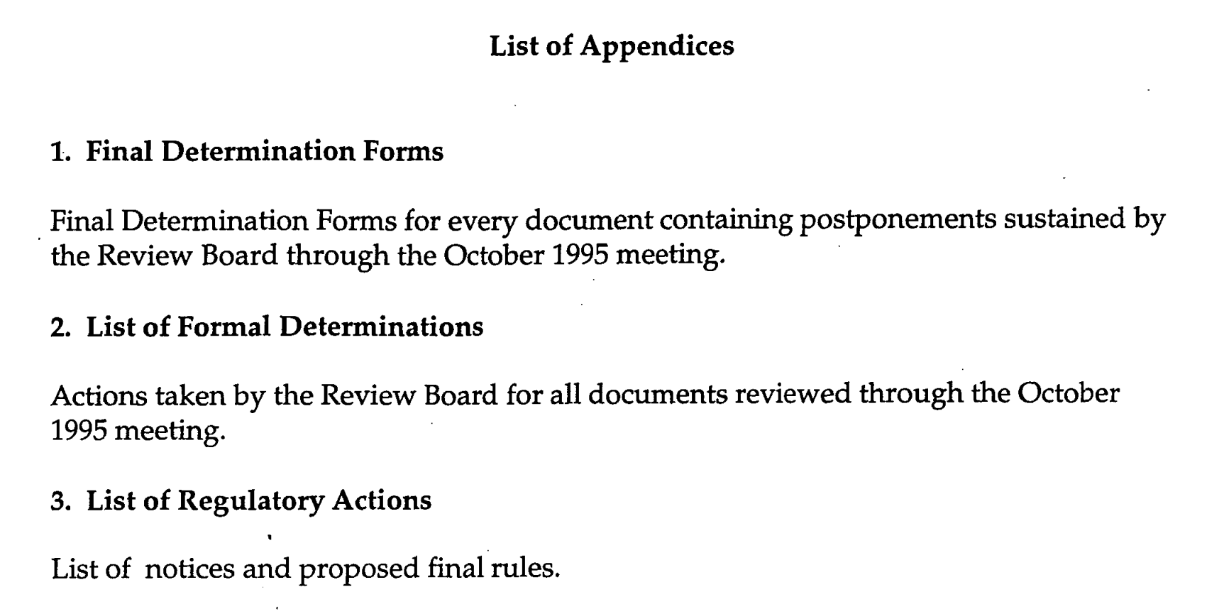 Strangely however, the final published ARRB Report for the year 1996 does not contain an appendix with all copies of the ARRB Final Determinations. This can be seen in a direct copy of the List of Appendices from the Final 1996 Report below.