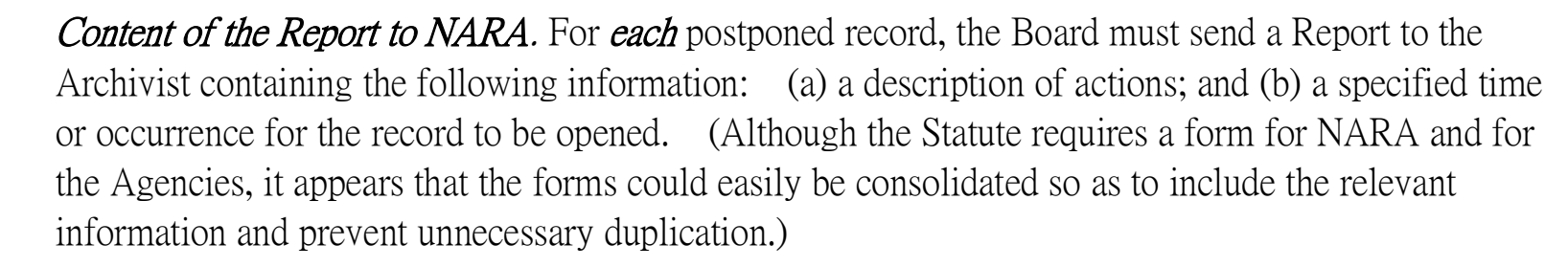 IMPORTANT NOTE: The “reports” required to be sent to the Archivist under 9(c)(3) (as mentioned in section 9(f)(3)(G)) were the only notifications wherein the ARRB was required to include all of the detailed written reasons for each postponement, the activities of the ARRB and the ordered date or occurrence for the triggering of periodic review or release of the record. 9(c)(3) “Reports” are the ARRB Final Determinations and the ARRB had a mandatory and non-discretionary duty to issue a Report every year during its operations that included an Appendix containing copies of all Final Determinations that it had issued during the year of the Report. Copies of the Reports were to be sent to the leadership of the Congress, the Committee on Government Operations of the House of Representatives, the Committee on Governmental Affairs of the Senate, the President, the Archivist, and the head of any Government office whose records have been the subject of Review Board activity.