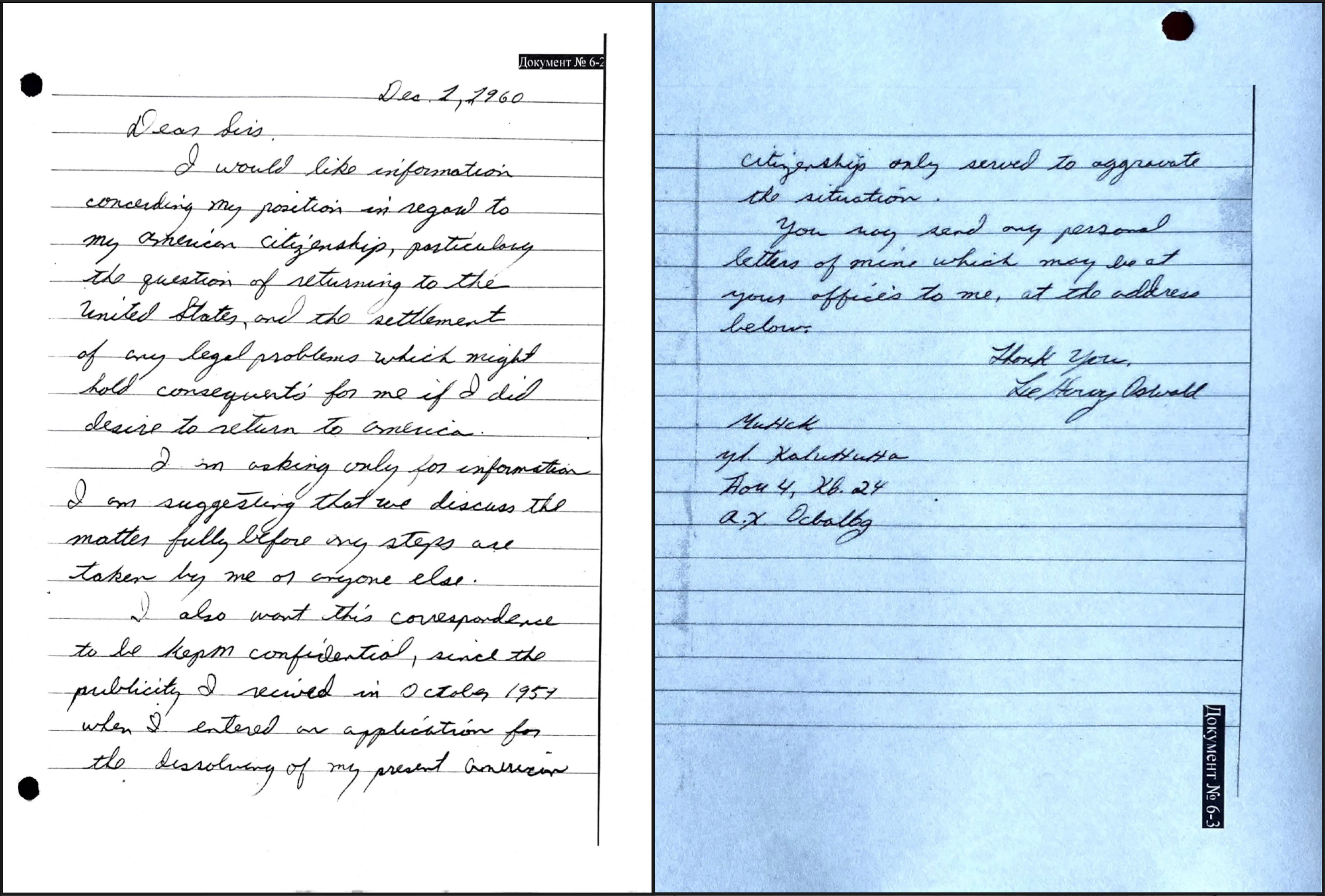 Copy of a letter purporting to be from Lee Harvey Oswald to the U.S. Embassy in Moscow, Dec. 1, 1960, identified as Documents 6-2 and 6-3 (Credit: Rosarkhiv)