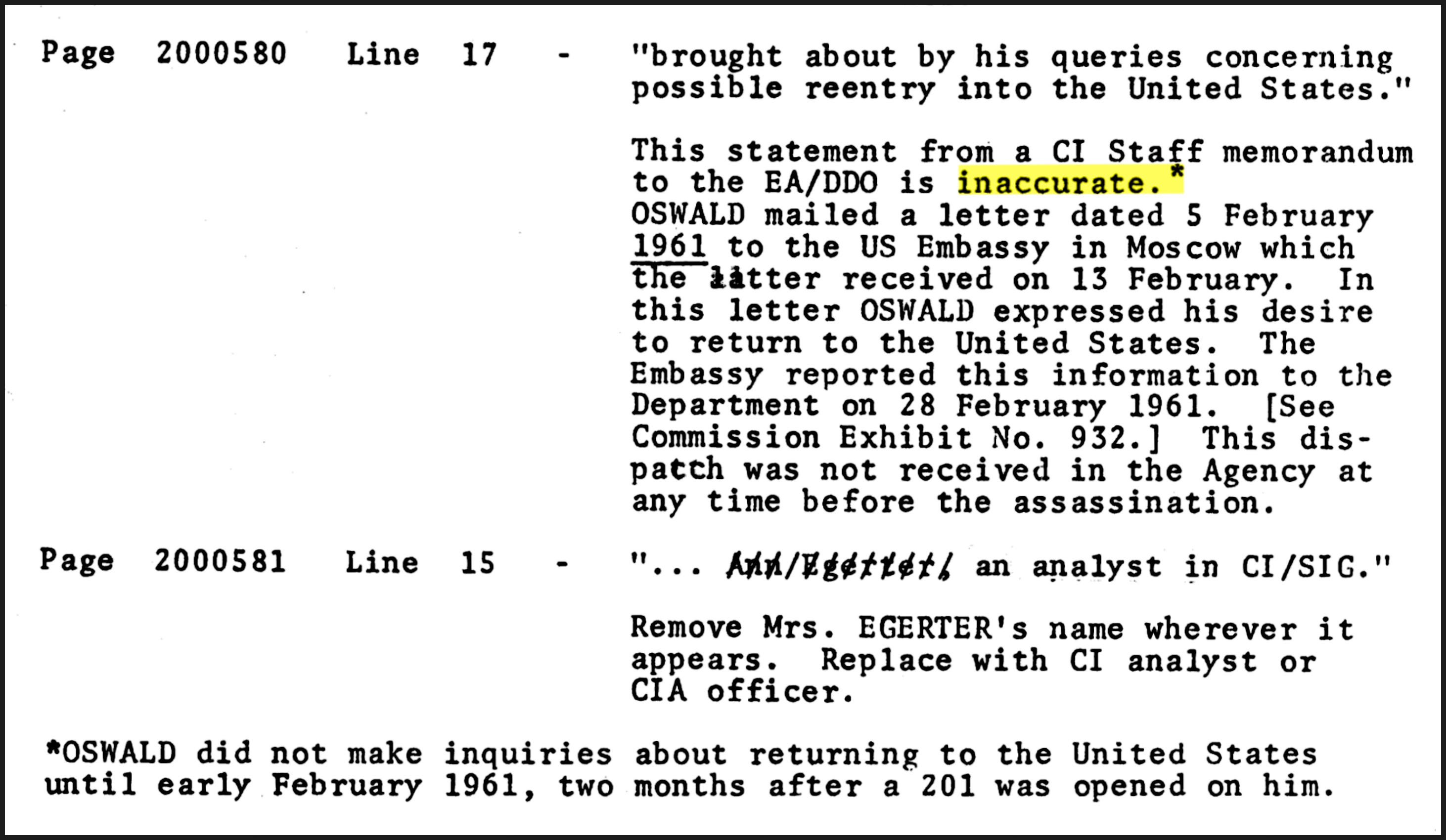 A few years later still, an undated CIA document entitled “Footnotes to Report on Pre-Assassination Docs in Oswald File” specifically labeled “inaccurate” Kalaris’ statement that the CIA had opened Oswald’s 201 file in response to his inquiries about coming home. An asterisk follows “inaccurate,” and at the bottom of the same page is written: