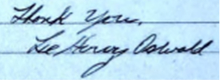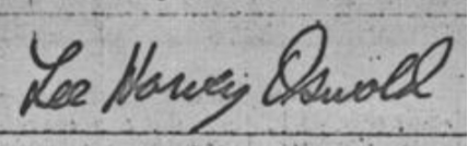 Although Oswald seldom wrote out his full name in handwritten correspondence, usually opting for the initial ‘H’ or simply “Lee Oswald,” there are a few instances in which he did write out his name to include the middle name. In most cases, the ‘e’ is quite clearly discernible, as in the signature at the bottom of his declaration of Nov. 3, 1959, requesting that his citizenship be revoked (C.E. 912):