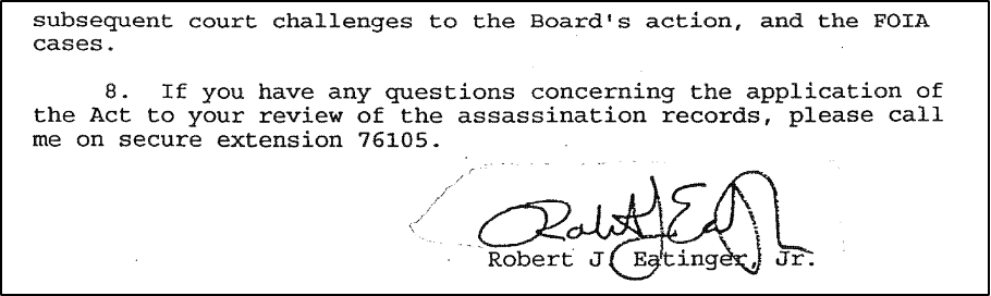 The authority of the ARRB to issue final binding and enforceable legal orders governing the postponement, periodic review and release of JFK assassination records has not been challenged. Even the CIA’s Assistant General Counsel Robert J. Eatinger Jr.’s December 14, 1992 analysis of the JFK Records Act acknowledged and confirmed that the Act codifies the judicial review process for all ARRB decisions.