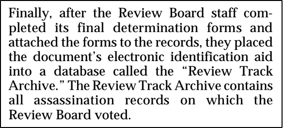 What these interviews with senior ARRB staff provide is a corroborated and detailed inside glimpse of the meticulously organized and consistent policies and system that the ARRB established to implement its mandate pursuant to the JFK Records Act. Rhodes, Voth, Horne, and Marwell all confirm that the review process culminated in the physical printing of Final Determination Notifications for each record that was reviewed and voted on by the ARRB Board for postponement of disclosure. Further, the interviews confirm that ARRB staff were directed to physically attach each printed Final Determination to the front of each assassination record which was contained in a file folder, before the completed record was transferred to NARA to be added to the JFK Records Collection. Finally, the interviews confirm that all ARRB activities and records, including the Final Determinations data, were in the Lotus Notes electronic database, backed up, and delivered to NARA.