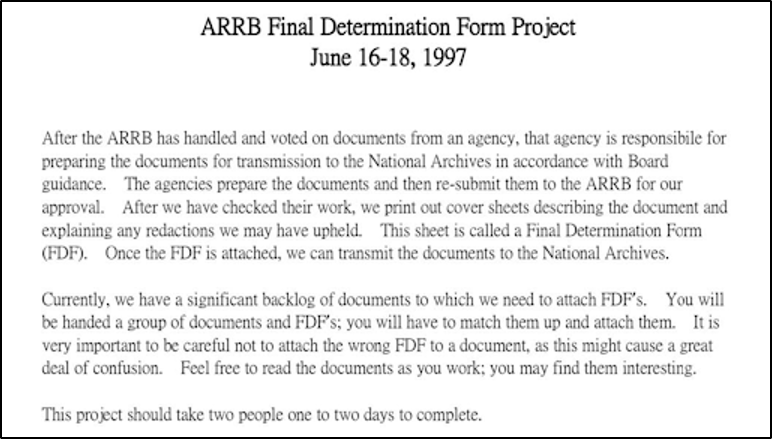Part One of the May 2025 article also referenced an internal ARRB memoranda dated June 16-18, 1997, showing that with a little more than a year until its mandate was to expire the ARRB was pushing out a large volume of Final Determinations, which were required to be physically attached to each assassination record before the records were transmitted to NARA to be added to the JFK Assassination Records Collection.