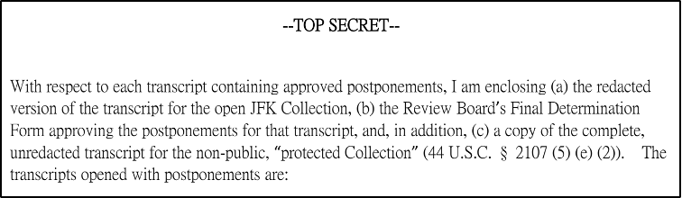 What this Memo suggested was a sea change in terms of the ARRB’s review process that would operate to stop the ARRB from using a scalpel to redact certain protected words or small sections of a record, and instead start to use a heavy cleaver to postpone the release of entire documents. Added to this approach to the review process was a massive change to the ARRB’s Final Determinations that seems to have stripped out the legally critical content of the FDNs mandated by section 9(c)(3). This included reasons or justifications for the ARRB’s postponement decisions and actions (including the section 6 basis for postponement) and the ARRB’s prescribed dates for periodic review or release of the assassination record.