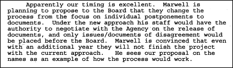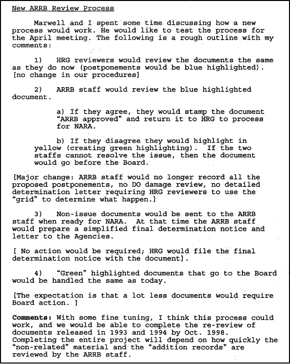 Particularly concerning is paragraph 3, which states that “the ARRB staff would prepare a simplified final determination notice and letter to the Agencies. [No action would be required; HRG (Historical Review Group) would file the final determination notice with the document].