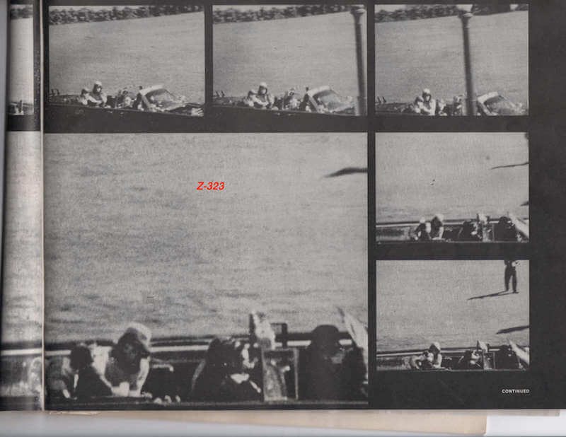 The difference between the two issues (I reserve comment on the putative second version [V2] since I have not seen it) centers on the frame 6 Zapruder film still and its corresponding caption. The earlier alternate version [V1] (produced before the final issue version was sent to the newsstands) shows JFK’s head and body up against the rear seat cushion, suggesting, when seen in sequence with the preceding frames, that he had moved backwards and to the left (see exhibit 12). This frame corresponds to Z-323. The caption for this frame on page 42 reads as follows: “The assassin’s shot struck the right rear portion of the president’s skull, causing a massive wound and snapping his head to one side” (see exhibit 9). The caption, however, seems to be telling you something different from what your own eyes tell you. Would you, from comparison with frame 5, exhibit 11, be led to conclude that JFK's head was “snapping to one side” or backwards and leftwards?