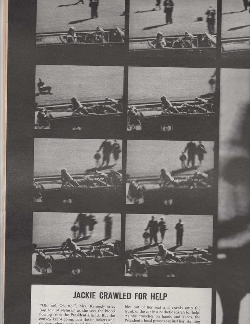 The feature begins with a story by Gerald Ford on the workings of the Warren Commission. On this same page are also eight captions describing the corresponding eight still frames of the Zapruder film displayed on the next four pages.