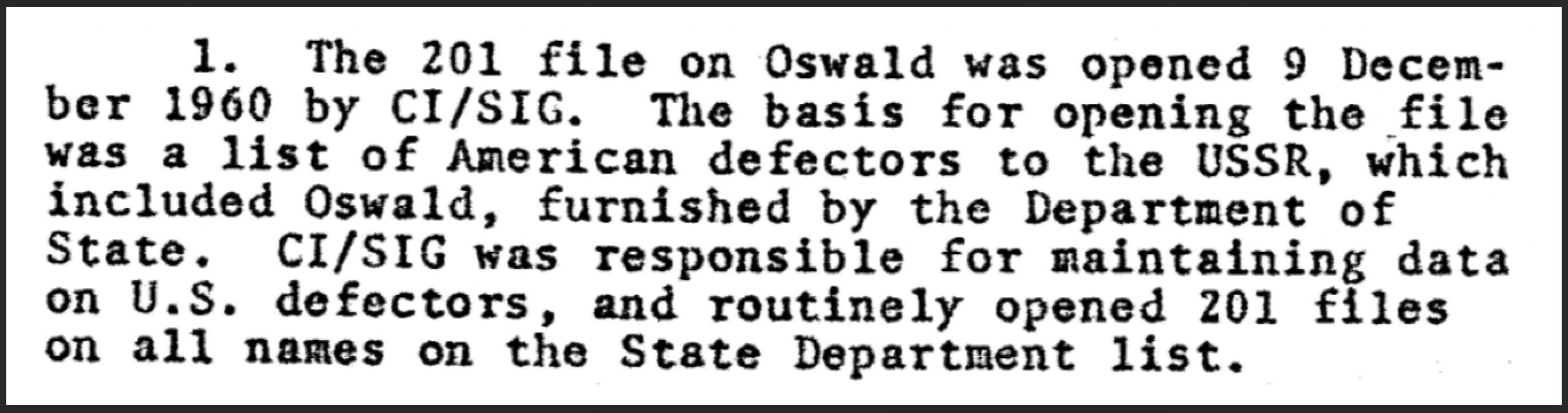 Kalaris’ slip-up in his September 1975 memo compounded mistrust of the official findings. Did someone in the CIA know of a December 1960 letter withheld from investigators? The ultimate reason the CIA gave for opening Oswald’s 201 file was that it was responding to the U.S. State Department’s request for information on American defectors in the USSR. This feels entirely plausible, but it also conveniently allows for complacent dismissal of Kalaris’ initial statement as mere bureaucratic error.