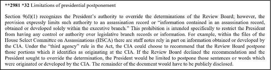 First, it is important to remember that there is no exception or special declassification rule for Congressional records in the JFK Act. They were all required to be archived in the JFK Records Collection in custody at NARA and to be included in the Archivist’s subject guidebook and index of the Collection. And unless they were transferred to NARA before the JFK Act and fully available to the public in unredacted form by October 26, 1992, congressional records required RIF numbers and identification aids for review and declassification by the ARRB. Second, these congressional records are not executive branch records. Yes, executive agencies like the CIA and FBI claimed (and still claim) equities in sequestered collections of the Church Committee and the HSCA. However, the President retained no discretion or authority over congressional records. In its 1992 Report that attended the passage of the JFK Records Act (Senate Report 102-328 page 25), the United States Senate ensured that Congress would maintain control over its own records, not the President. This was codified in section 9(d)(1) of the JFK Records Act.