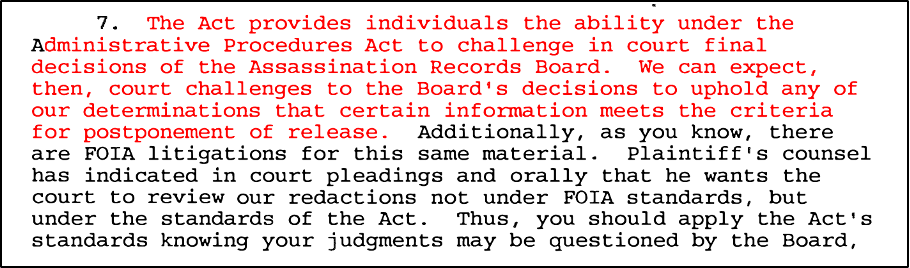 The entire legal framework of the JFK Records Act was built around the basic concept that the ARRB’s Final Determinations could be enforced by the public to ensure that the government could be held to account for any unjustified delay in the release of the assassination records. Once the ARRB terminated its operations, this singular issue should have been squarely in the focus of all lawyers, researchers, and the National Archives. Any lawsuit for the release of records should identify section 9(c)(3) of the Act and seek disclosure of the ARRB Final Determinations and compliance with the ARRB orders. This is not only the key that unlocks the enforcement mechanisms of the Act with respect to postponed records, but it is the key to understanding which records avoided Board review.