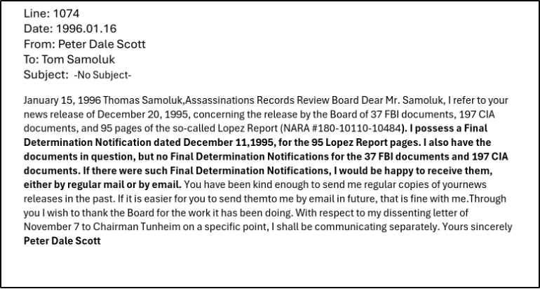 Several telephone interviews were conducted in the summer and fall of 2025 with ARRB staff, including Chet Rhodes (Computer Specialist), Peter Voth (Analyst/Assistant Computer Specialist), Doug Horne (Chief Analyst for Military Records) and David Marwell (Executive Director), in order to get to the bottom of how the ARRB’s assassination records filing system and the processes involving the ARRB Final Determination Notifications actually functioned in practice.