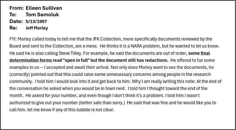 Part One of the May 2025 article also referenced an internal ARRB memoranda dated June 16-18, 1997, showing that with a little more than a year until its mandate was to expire the ARRB was pushing out a large volume of Final Determinations, which were required to be physically attached to each assassination record before the records were transmitted to NARA to be added to the JFK Assassination Records Collection.