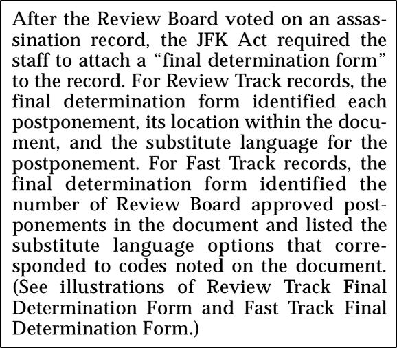When the Board completed voting on a record, ARRB staff would finalize the records file by physically attaching the Board-approved version of the Final Determination Notification to each assassination record so that it would act as a coversheet and tracking aid for the record.