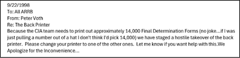 Literally 8 days before the ARRB closed operations, the Analyst and Assistant Computer Specialist at the ARRB wrote an internal email to all ARRB staff notifying them that the ARRB’s CIA Team had to print out over 14,000 paper copies of the Final Determination Notifications.