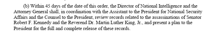 This sounds clear and powerful enough. However, with respect to assassination records in the JFK case, what does President Trump’s order actually require in terms of legal action?